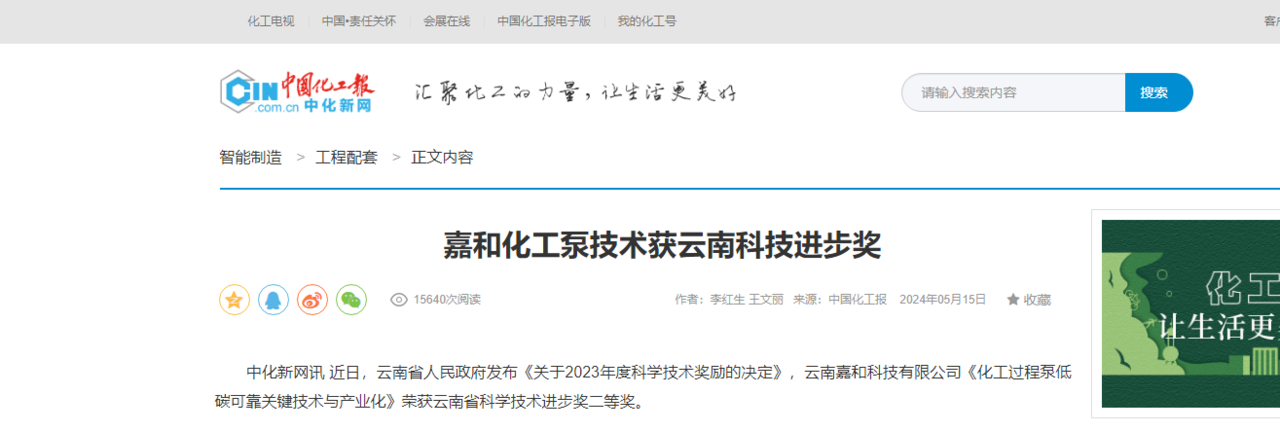 嘉和化工泵技術(shù)獲云南科技進(jìn)步獎(jiǎng)
